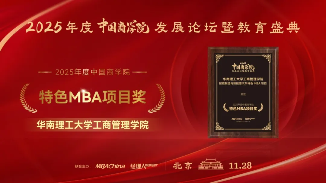 凭借“管理+工科”深度融合的培养模式、雄厚的师资力量、丰硕的办学成果,我院MBA项目连续两年荣获“2025年度中国商学院MBA项目TOP 100”第18位。同时,依托智能制造与大数据方向班、新能源汽车方向班的突出优势,我院MBA项目获评“2025年度中国商学院特色MBA项目奖”。