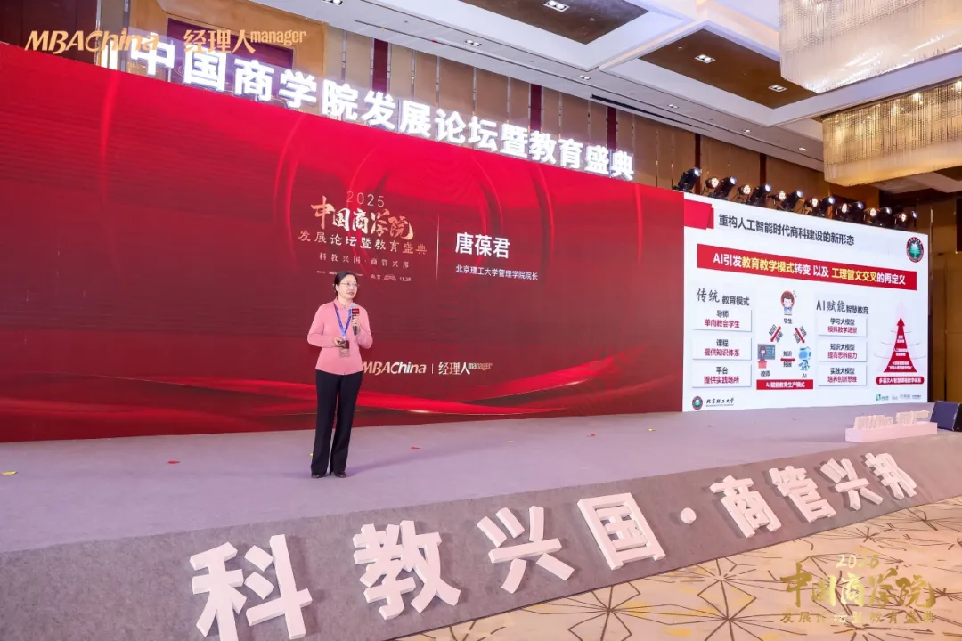 2025年11月28日,由MBAChina和《经理人》杂志联合主办的“2025年度中国商学院发展论坛暨教育盛典”在北京召开。本次盛典以“科教兴国、商管兴邦”为主题,来自全国百余所院校的三百余位院校领导、专家学者与行业代表参加会议,聚焦中国商科教育未来图景,碰撞前沿思想,分享最佳实践,凝聚发展共识,共探中国商科教育的革新方向。以管理创新助推现代化进程,以使命担当引领高质量发展。北京理工大学管理学院院长唐葆君、副院长陈翔、院长助理兼专业学位教育联合中心主任吴水龙、副主任齐英杰应邀参加此次论坛。