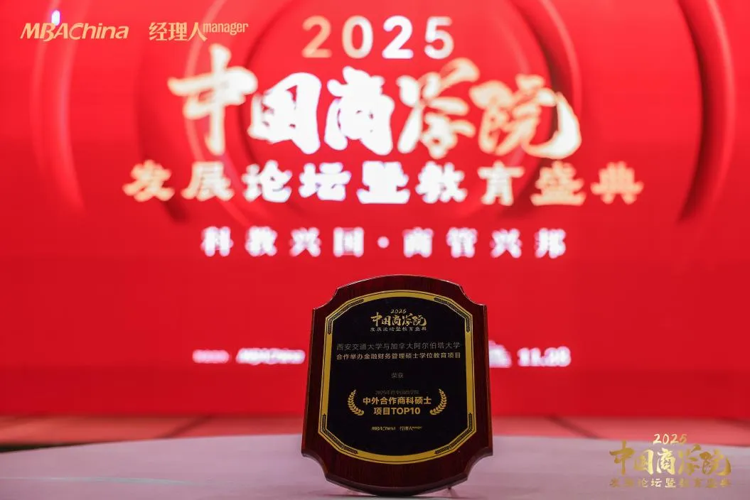 西安交通大学与加拿大阿尔伯塔大学合作举办金融财务管理硕士(MFM)学位教育项目,荣膺“2025年度中国商学院中外合作商科硕士项目TOP10”第3名。