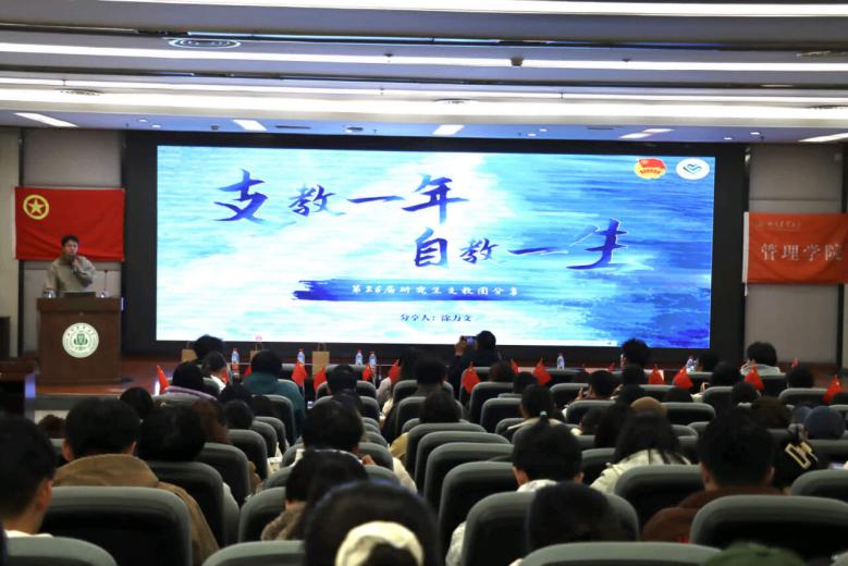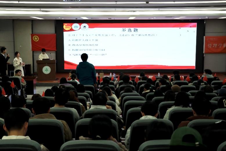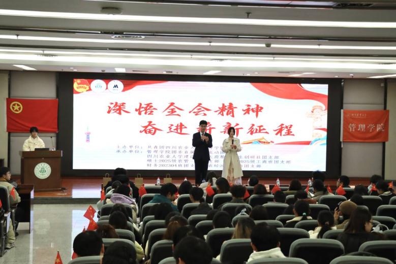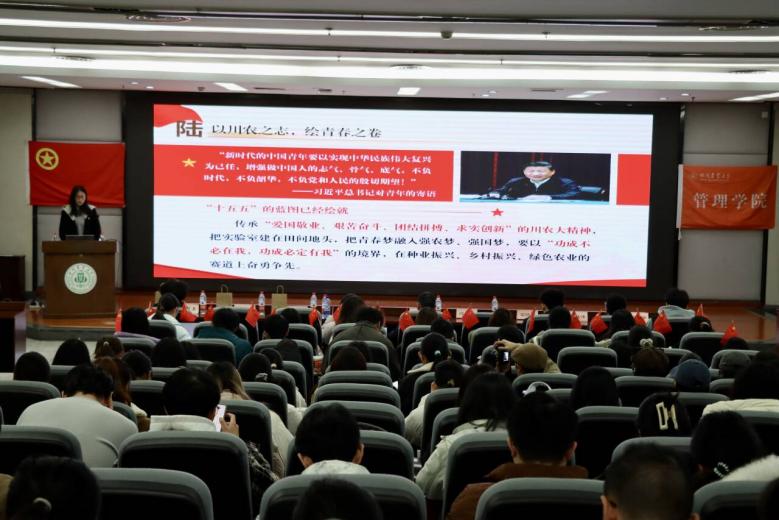 为深入学习贯彻党的二十届四中全会精神,引导广大团员和青年深刻领悟全会重大战略部署,12月5日,管理学院联合四川农业大学建设高端“天府粮仓”学生创研社团支部开展“深悟全会精神,奋进崭新征程”主题示范性班团活动。学院党委办公室主任兼团委书记马刚以及200余名团员青年齐聚一堂。