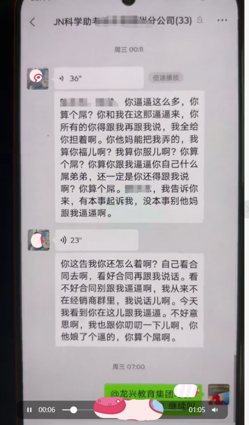 辱骂挑衅合作伙伴:有代理商曝出,龙兴教育创始人曾在群内单方面、无端辱骂挑衅代理商,合作态度极其恶劣,毫无商业信誉可言。