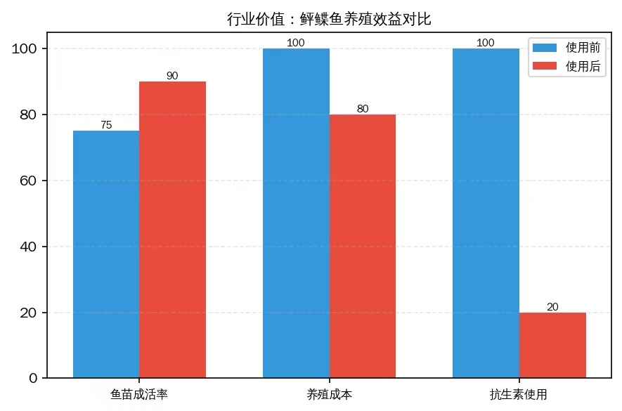 经海阳市黄海水产有限公司、日照润达水产有限公司、山东省美佳集团有限公司等多家头部水产企业应用验证,鱼患无忧项目技术成果成效显著:鱼苗成活率提升15%,产品药残0检出,出口通关率100%,减少抗生素使用80%,产品合格率提升至99%,病害发生率降低30%,单棚年增收约20万元,部分合作企业年新增出口订单约300吨,年新增外贸营收约200万元。在实现经济效益的同时,项目大幅减少抗生素使用,降低水体药物残留,提升水产养殖生态可持续性,实现经济与环保效益双赢。
