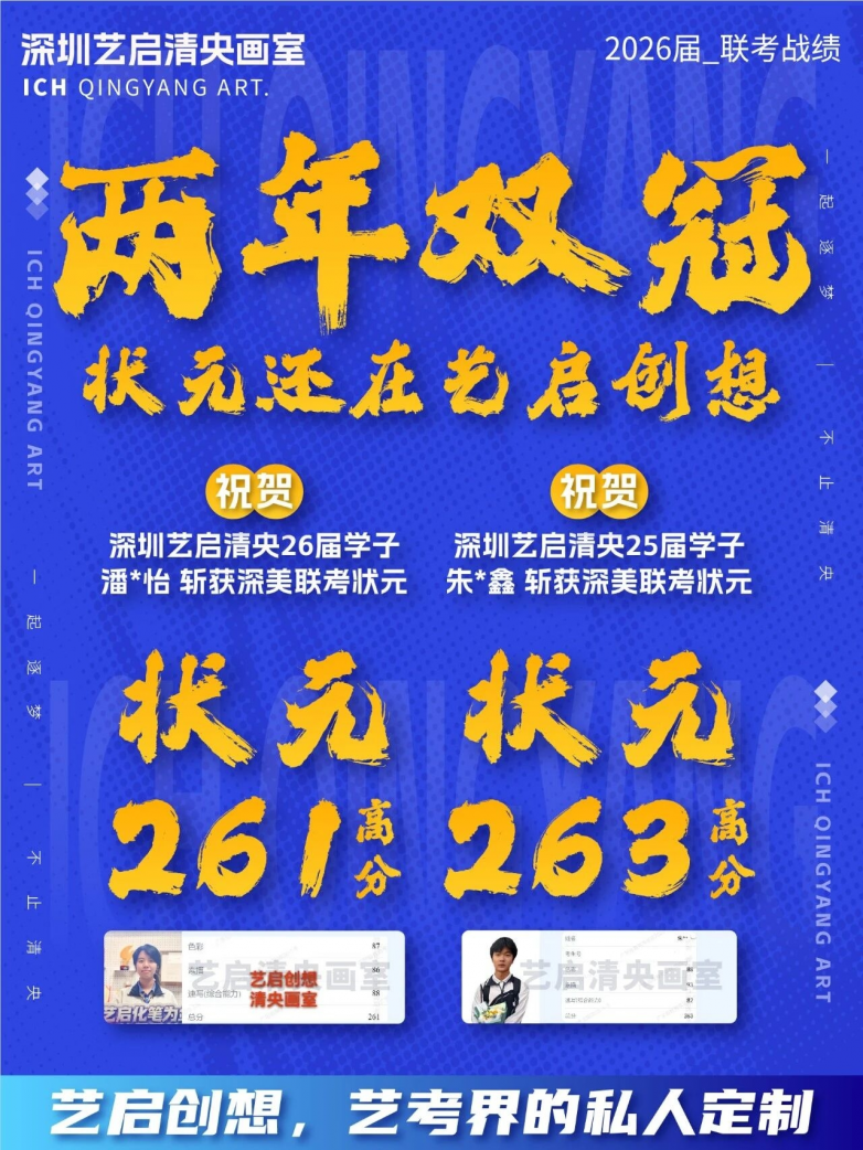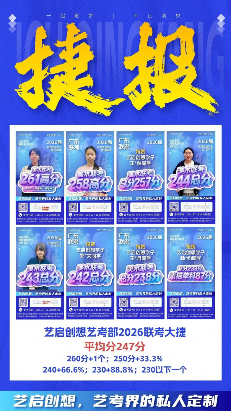 中高考战绩斐然,升学保障有力:中考层面,连续五年专业通过率达100%,助力学子顺利拿下中考艺术特长生加分、冲刺美院附中;高考层面,战绩逐年攀升——2025届首届高考,10名学生联考平均分达246.5分,最高分263分,斩获4张央美、1张清华、2张国美、4张广美复试证;2026届联考平均分247分,最高分261分,连续两年斩获罗湖区联考状元,同时拿下3张央美合格证、4张国美合格证、5张广美合格证,用实力兑现升学承诺。